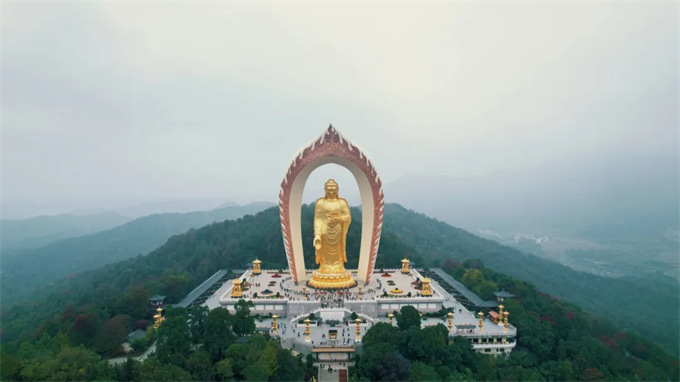 48米高的東林大佛,屹立在高山之巔,是中國少有的露天阿彌陀佛銅像。拾階而上,走過信愿路,拜過蓮花臺,跨越接引橋,登頂極樂路,來到圣象腳下,感受風間云動,感悟內心滄海。